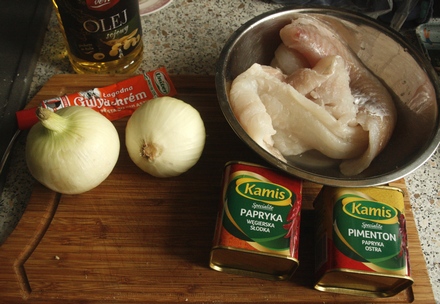 Filety pokroić w szerokie paski lub w kostkę, posolić. Cebulę pokroić w półplasterki. Olej rozgrzać, poddusić cebulę, po odsunięciu z ognia i lekkim przestudzeniu posypać ją co najmniej dwiema łyżeczkami papryki słodkiej. Ponownie postawić na ogień, a po chwili dodać filety.