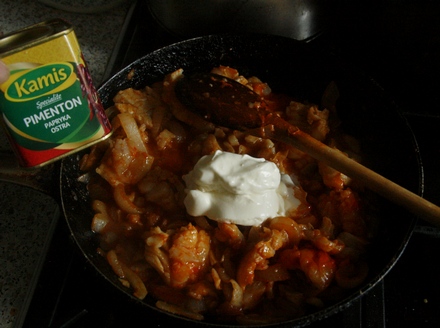 Na końcu doprawić papryką ostrą. Podawać paprykarz gorący, z kleksem białej śmietany.