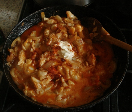 Rybę dusić z cebulą 10–15 minut. Dodać węgierską pastę do gulaszu. Wmieszać śmietanę.