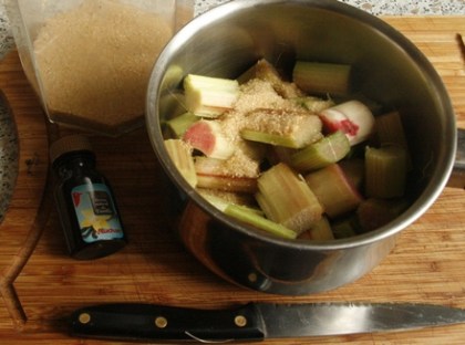 Aby ją otrzymać, należy łodygi obrać z włókien. Pokroić na kawałki, podlać odrobiną wody, dodać cukier (mój był ciemny, ale to niekonieczne) i wanilię. Gotować w rondelku, co jakiś czas mieszając. Rabarbar trzymany na ogniu krótko się nie rozpadnie, ale na marmoladkę trzeba go gotować dłużej. Przestudzić i nałożyć na ciasto: francuskie, kruche lub właśnie na sernik.