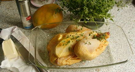 Naczynie do pieczenia natrzeć masłem. Ułożyć kurczaka i obłożyć masłem (kawałeczki włożyć za skrzydełka i nóżki, większą kostkę dać na wierzch). Piec jak zwykle (przez 10–20 minut w temperaturze 200 st. C, potem tuszkę odwrócić i piec przez pół godziny w 160 st. C; można podlać troszkę wodą i polać z wierzchu ze dwa razy.