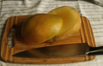 Owoc trzeba kroić wzdłuż tej pestki (wyczujemy ją płasko trzymanym nożem). Otrzymane cząstki albo obieramy ze grubej skóry i kroimy, albo nacinamy kostki do skóry, a następnie od niej odcinamy. Następnie odcinamy kostki owocu z miąższu, który pozostał przy pestce.