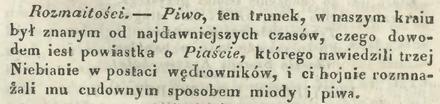 Piwo, ten trunek, w naszym kraiu był znanym od najdawniejszych czasów, czego dowodem iest powiastka o Piaście, którego nawiedzili trzej Niebianie w postaci wędrowników, i ci hojnie rozmnażali mu cudownym sposobem miody i piwa. Był to zapewne w owych odległych wiekach tylko prosty napój ze słodu, któremu późniejsze dopiero wynalazki nadały lepszość i w różne zmieniły gatunki.