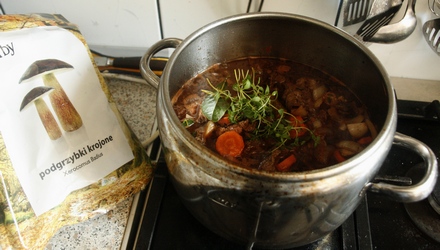 Dolać wino i bulion, wrzucić bouquet garni. Na najmniejszym płomieniu dusić, aż mięso zmięknie. Gdy to się stanie, dorzucić grzyby. Wymieszać, jeżeli trzeba, dodać bulion. Sos ma być jednak zawiesisty, nie za rzadki. Sprawdzić smak, w miarę potrzeby dosolić lub dopieprzyć. Przed podaniem wyjąć bouquet garni, danie posypać świeżymi listkami tymianku i natki.