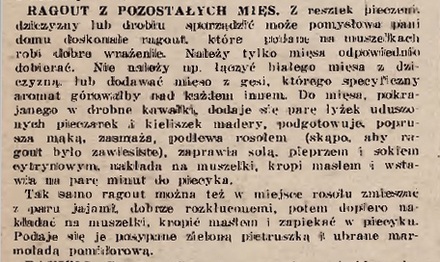W „Asie”, wydawanym przez krakowski koncern prasowy Mariana Dąbrowskiego, kolumnę kulinarną prowadziła Zofia Szyc-Korska. Związana była także z „Ilustrowanym Kuryerem Codziennym”. Na jego damskich kolumnach odpowiadała czytelniczkom i zamieszczała swoje propozycje kulinarne. Musiała lubić potrawy typu ragoût, bo zamieszczała często ich receptury. Zwłaszcza wiele ich znalazło się na łamach „Asa”. Na początek jej propozycja na ragoût z mięsnych resztek. Bardzo ciekawa propozycja, prawda? Wykorzystanie resztek zawsze popieram. W kuchni nic nie powinno się marnować.