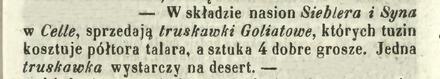 Od niejakiego czasu chodują [!] w Europie, olbrzymie owoce, a pomiędzy innemi truskawki Goliata, których niektóre jagody dochodzą do 2ch i 2 1/2 cali średnicy. Sześć flanc tego ostatniego gatunku truskawek, przywiozła niedawno z Drezna do Warszawy, jedna z znakomitych Dam tutejszych. Gdy wyrosną i owoc wydadzą, mamy już zapewnienie że się ukażą w liczbie osobliwości różnego rodzaju zbieranych w Redakcji Kurjera, na czem niewątpliwie puszka biednych skorzysta. Już w lecie r. z . wystawiono podobnego gatunku mamuty, w szklarni Ogrodu Saskiego, a słynna autorka angielska Panna Edgeworth, w jednej z powieści swoich obyczajowych, wspomina o truskawkach Brobdygniagach, co dowodzi że przed laty kilkadziesiąt, tego rodzaju olbrzymy, znane już były w Anglji.
