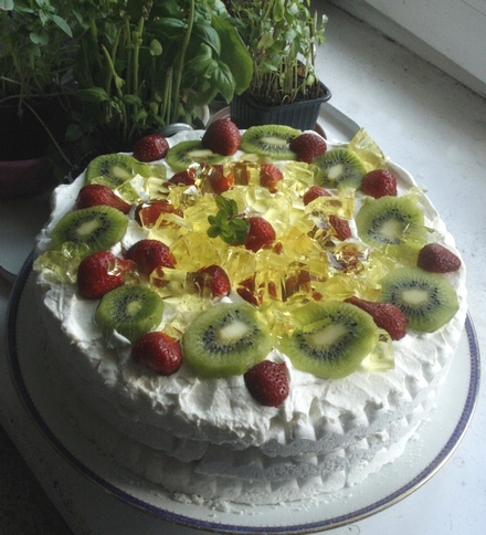 Owoce pokroić w plasterki. Galaretkę pokroić w drobniutką kostkę. Śmietanę ubić z cukrem pudrem na sztywno. Dodać wanilię i sok z cytryny. Blaty bezowe smarować bitą śmietaną, przekładać plasterkami owoców. Wierzch posmarować warstwą kremu śmietanowego, udekorować plasterkami owoców i kosteczkami galaretki. Deser wstawić do lodówki. Przed podaniem posypać listkami świeżej mięty lub melisy.