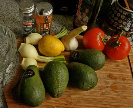 Do guacamole rozcieram blenderem miąższ awokado – obrany z grubej skóry i odjęty od pestki – łączę go z miąższem pomidora (bez wodnistego otoczenia pestek), posiekaną jak najdrobniej cebulką i czosnkiem. Gdyby sałatka (albo sos) była za gęsta, rozprowadzam ją oliwą i sokiem z cytryny (próbując, czy nie za kwaśna). Doprawiam solą i ostrą cayenne.