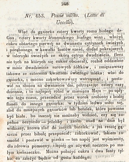 Nazwał jednak zupełnie błędnie polecany przez siebie napój, czyli owo Ptasie Mleko. A może to zecer źle złożył, a korektor nie zauważył? Proszę zwrócić uwagę na tę pomyloną nazwę. No i na ciekawy pomysł na „zdrowotny” napój na lato.
