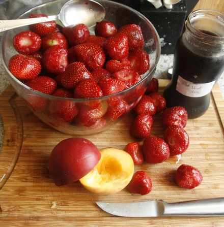 Brzoskwinie umyć, przepołowić, zakrzywionym nożykiem wyjąć z nich pestki (jeżeli same nie wychodzą). Miąższ pokroić w cienkie półplasterki. Truskawki podzielić na dwie lub na trzy części. W salaterkach porcjowych lub na talerzykach dekoracyjnie rozłożyć oba owoce. Skropić je octem, przybrać listkami lub gałązkami mięty. Deser koniecznie schłodzić.