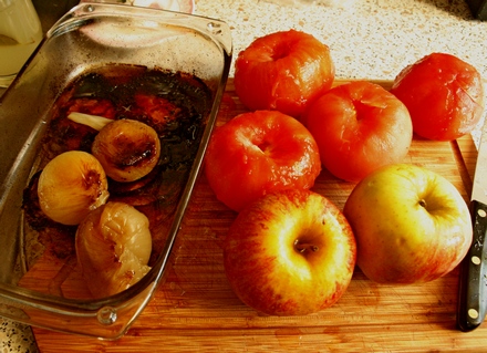 Pomidory zblanszować we wrzątku, obrać ze skórki. Wyciąć twarde miejsca, miąższ pokroić na kawałki. Wrzucić je do rondelka, podlać rozpuszczoną kostką bulionową, dorzucić cebulę. Dusić na sos, aż pomidory się rozgotują (ok. 1/2 godziny). Jabłka obrać na końcu, usunąć z nich gniazda nasienne, miąższ pokroić w kostkę. Od razu dodać do sosu. Dusić, aż i one zmiękną.