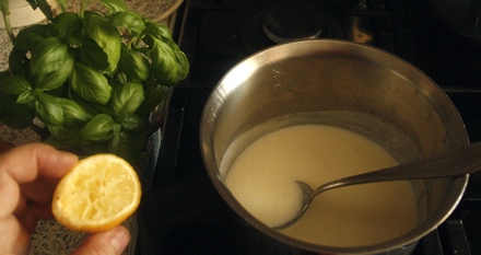 Najpierw przygotować sos biały: zasmażyć masło, na chwilę odstawić z palnika. Dolewać stopniowo mleko, mieszać energicznie, aby nie powstały się grudki. Ponownie postawić na palniku, gotować mieszając, doprawić solą, pieprzem startą gałką muszkatołową i sokiem z cytryny. Zestawić z ognia, wsypać posiekaną bazylię. Odstawić, od czasu do czasu mieszać.