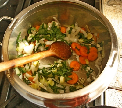 Warzywa przygotować, pokroić. Oliwę rozgrzać w naczyniu z grubym dnem, kolejno wrzucać marchewkę, cebulę, czosnek, bazylię (cały pęczek), do smaku przyprawić, poddusić. Dodać mięso, mieszać na dość mocnym ogniu, aby się zasmażyło.