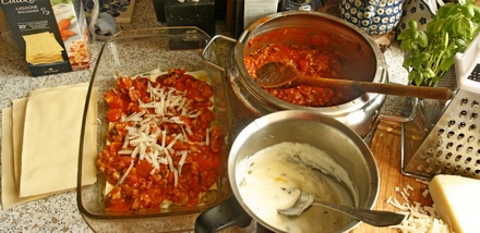 Na lasagne kłaść sos mięsno-pomidorowy i nieco startego sera. Przekładać je płatami makaronu. Liczba warstw zależy od tego, ile mamy sosu, zwykle są cztery-pięć. Ostatni płat dokładnie posmarować sosem białym i obficie posypać startym serem.