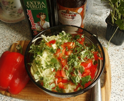 Do naszej lazanji (że spolszczę), sporządziłam sałatkę, a właściwie surówkę. Prostą, tylko z dwóch warzyw. Jedno na pewno z pochodzenia włoskie, o czym świadczy choćby nazwa. To cukinia (zucchini). Możną ją jeść na surowo, zwłaszcza tę młodą. Ma świeży smak orzechowy. Połączyłam ją z soczystą czerwoną papryką.