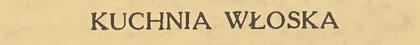 Triumfem włoskiej kuchni, są wyroby cukiernicze, ciasto i pieczywo, przyrządzane najrozmaitszymi sposobami. Włosi posiadają pozatem mnóstwo oryginalnych potraw, jak: Polenta – rodzaj wybornej zupy [!] z kukurydzy; Risotto, które ma kilkanaście odmian; Minestra, – wyśmienita zupa z jarzyn, ryżu i makaronu, do której dodają szynkę, kiełbasę i ser., przyprawiając to wszystko aromatycznemi ziołami; Grizini [oczywiście: Grissini] – rodzaj sucharów z domieszką kaszy [?]; Agnoloti [agnolotti; pierożki] – doskonałe naleśniki [?], nadziane siekanem mięsem; Ravioli – siekane mięso i jarzyny, zawijane w cieście. We Włoszech mięso i drób są bardzo nieszczególne, z tej racji używają dużo siekaniny. Natomiast doskonałe są ryby, które włosi [tak pisano wtedy nacje] potrafią świetnie przyrządzać. Z jarzyn najbardziej rozpowszechnione są: Finochi [finocchi; koper włoski] i Brocoli [broccoli; brokuły] – mało znane gdzieindziej. Największą popularnością cieszą się pomidory, które we Włoszech są znakomite. Jako sery, używane są Parmezan i Gorgonzola, mogące [tylko ta druga!] konkurować z Roquefort’em. Masło we Włoszech pozostawia wiele do życzenia. Kombinacyj z pomidorów, ciasta, ryżu, kukurydzy i parmezanu jest bez liku. Z ciast włoskich zasługuje na wzmiankę Pasta Ivolla [?] – neapolitańskie ciastka z migdałami, następnie francuskie ciastka przekładane konfiturami, przypominające Strudel bawarski. Wogóle [tak pisano!] ciastka włoskie grzeszą zbytnią słodyczą, gdyż połowę ich zawartości stanowi cukier. Co do napojów – najwięcej rozpowszechnione są wina z Wezuwjusza i Sycylii. Chianti – niezłe wino stołowe; Asti – słodkie, musujące, dobre wino deserowe.