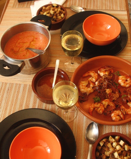 Na przykład takie krewetki podane w bardzo ostrym sosie. Kto je lubi, znajdzie w nich wiele zadowolenia. A że podałam do nich hiszpański chłodnik – gazpacho – pożywi się u mnie także ten, kto nie przepada za owocami morza.