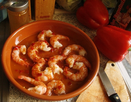 Z oliwy, soku z cytryny, soli, wszystkich rodzajów papryki mielonej oraz posiekanej papryczki chili sporządzić marynatę, najlepiej wlewając wszystko do słoika i energicznie potrząsając. Krewetki – mrożone rozmrozić – zalać marynatą, zostawić co najmniej na kwadrans.