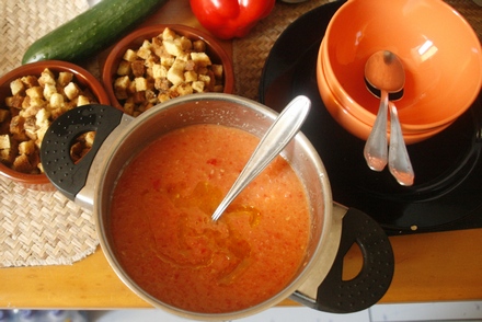 Do ciepłych krewetek podajmy gazpacho z lodówki. W mikserze przyrządzimy je błyskawicznie. Da nam wiele zadowolenia, byle tylko się dostatecznie schłodziło. Gdyby czasu na to było zbyt mało, można je oziębić wrzuconymi kostkami lodu. Wtedy zróbmy je gęstsze. Kto się nie boi węglowodanów, może z warzywami zmiksować kromkę pszennego chleba (sam miąższ, bez skórki). Ja to pominęłam.