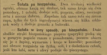 W tym właśnie piśmie znalazłam garść przepisów z kuchni tak odległych, jak serbska i hiszpańska. Są to m.in. dwa dania nazwane sałatą. Pierwsze można podać właśnie jako chłodnik, czyli nasze gazpacho. Autor recepty o tym pisze. Drugie zresztą także można rozrzedzić do konsystencji zupy, choć nie jest to już wspomniane.