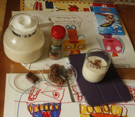 W gorący dzień koktajl warto schłodzić. Wlać do dzbanka i wstawić do lodówki. My się przekonaliśmy, że przyprawę korzenną cynamon nie każdy lubi. Agatka go uwielbia, ale Adasiowi nie smakuje. Uwaga więc: przed posypaniem koktajlu lepiej wypróbujmy, kto jest amatorem cynamonu, a kto nie lubi jego specyficznego zapachu i smaku. Można przecież poprzestać na posypaniu koktajlu czekoladą. Nie spotkałam nigdy nikogo, kto by jej nie lubił.