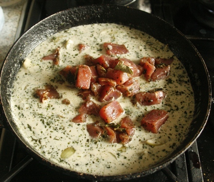 Do dania użyłam mrożonki o nazwie „8 ziół”. Kupiłam ją dla wypróbowania. Sprawdziła się podkreślając smak dania i przydając mu świeżego wyglądu. W skład tych ziół wchodzą: natka pietruszki, szczaw, rzeżucha, czosnek, szczypior, krwiściąg mniejszy, trybula ogrodowa oraz ogórecznik lekarski. Kompozycja udana.