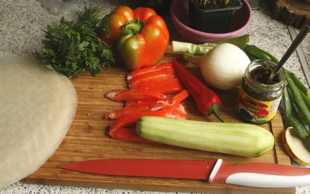 Przygotować nadzienie: posiekać mięso kraba i warzywa. Doprawić pastą z kolendry, sosem sojowym i pieprzem. Wymieszać.