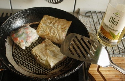 Naleśniki zanurzać w letniej wodzie. Wyjmować, gdy zmiękną. Na każdy nakładać porcję nadzienia. Zwijać w rulonik lub pakiecik zakładając brzegi, aby farsz nie wypadł podczas smażenia.