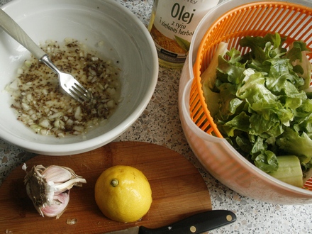 Sałatę umyć i osuszyć. Listki podzielić na minejsze. Na dnie miski energicznie wymieszać sok z cytryny z pieprzem i posiekanym lub roztartym czosnkiem, nie przerywając mieszania dodać łyżeczkę lub dwie musztardy. Ubijając powstały krem, wlewać strużką olej, aż powstanie dość gęsty sos. Spróbować. Do smaku doprawić solą lub cukrem, co kto lubi. Liście sałaty doprawić tuż przed podaniem.