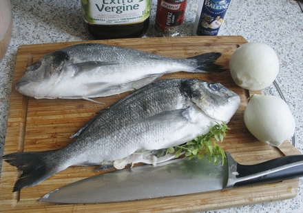 Cebule pokroić w ćwiartki lub ósemki. Czosnek posiekać. Dorady oczyścić, obmyć, ich wnętrza wypełnić gałązkami bazylii, czosnkiem i ćwiartkami cebulki. Naciąć płytko ich skórkę (3–4 razy). W nacięcia włożyć po cienkim plasterku czosnku. Ryby umieścić w brytfance z kratką lub w foremce wysmarowanej oliwą. Obłożyć ćwiartkami cebuli. Wszystko skropić oliwą, posolić, popieprzyć. Wstawić do piekarnika nagrzanego do 200 st. C. Pod kratkę brytfanki wlać pól szklanki wody. Piec 20 minut.