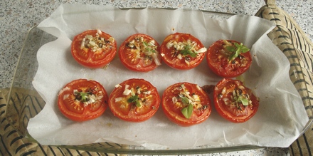 Pomidorki trzymać w piekarniku godzinę. Podawać gorące, przybrane świeżymi ziołami.