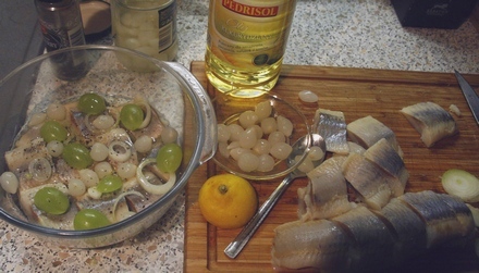 Śledzie układać w naczyniu, przekładać plasterkami cebuli, marynowanymi cebulkami, połówkami winogron, cienkimi plasterkami cytryny (bez pestek), posypywać pieprzem oraz skrapiać olejem. Warstw może być kilka, a co najmniej wie. Na wierzchu ułożyć cebulki z winogronami i plasterki cytryn, obficie posypać pieprzem z młynka i ziarenkami pieprzu czerwonego, polać olejem.