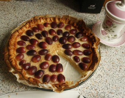 Na upieczonym spodzie ułożyć połówki winogron. Dopiekać przez 5 minut.