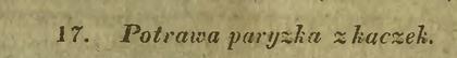 Owóż, kładzie się łyżka masła do rądla, i wrzuca się do niego kilka plasterków słoniny. Słonina skoro się przyrumieni, wyjmuje się i na bok odkłada, a w pozostałe masło kładą się np. dwie kaczki, które również po przyrumienieniu wyjąć należy. Poczem masło zapala się mąką, i dolewa wodą lub też buljonem. Następnie wkłądają się napowrót kaczki i słonina, i dodaje się natki pietruszczanej, kilka bobkowych liści, pieprzu, angielskiego ziela, dwa lub trzy goździki i ząbek czosnku. Z tem wszystkiem gotuje się przez dobry kwadrans, a nakoniec przydaje się około dwudziestu małych cebul; a gdy się te ugotują, tak przyrządzone kaczki podają się na stół, i konsumują z wielkim apetytem, którego wszystkim życzymy.