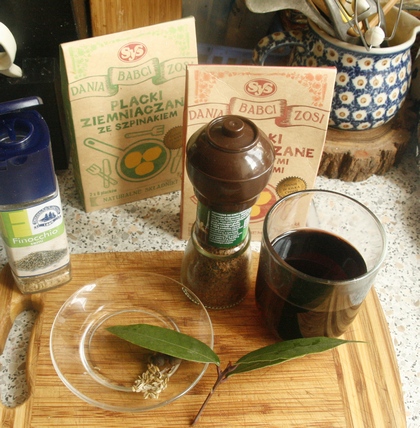 Do kaczych nóżek dodatkowo usmażyłam placki ziemniaczane – o zgrozo – z gotowych paczuszek. Takie do rozrobienia tylko z wodą. Jak widać na zdjęciu, są dostępne w wersjach z dodatkiem suszonych pomidorów oraz ze szpinakiem. Może nie jest szczytem elegancji korzystać z takich gotowców, ale jak ułatwia to życie. Warto szukać takich półproduktów, których jakość zaakceptujemy i ułatwią nam codzienne gotowanie. Oczywiście dla gości szczególnych, albo gdy będę miała więcej czasu, sama zetrę mączyste ziemniaki i usmażę z nich placki. Na pewno będą lepsze. A stanowią ciekawy dodatek do kaczki, zwłaszcza tej w sosie.