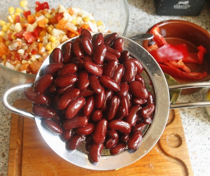 Jak widać, tu dodatkiem do rosołowej włoszczyzny był kalafior. A warzywa związał zimny sos musztardowy. Poszłam inną drogą. Kierując się upałem i stanem domowych zapasów (ta sałatka znakomicie pożytkuje resztki!), poszłam, czego może na pierwszy rzut oka nie widać, w stronę Meksyku.