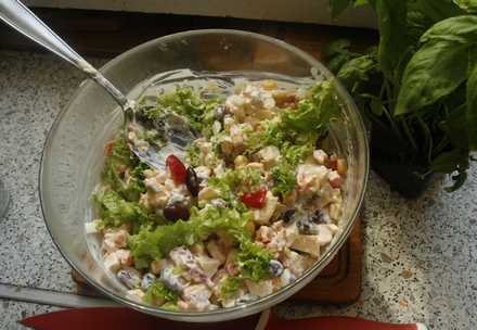 Już po wymieszaniu z majonezem, na końcu, przed podaniem, wkroiłam paski kruchej zielonej sałaty.