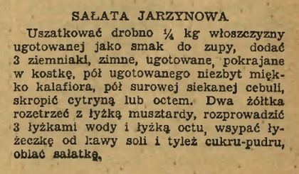 Na obiad do tzw. brzuszków z łososia (w stoisku z rybami w Hali Mirowskiej kupiłam takie obrane ze skórki i tłuszczu, pełne smaku, bo z wędzenia ryby na zimno) podałam dwie sałatki. Jedną była tradycyjna, nazywana na świecie sałatką rosyjską, a u nas majonezową jarzynową. Zwykle przygotowuję ją wtedy, gdy po ugotowaniu rosołu lub wywaru zostają warzywa. Czyli włoszczyzna (marchew, seler, pietruszka). Do nich najczęściej, zgodnie z tradycją, dodaję ugotowane w mundurkach ziemniaki, jajka na twardo, ogórki kiszone lub konserwowe albo marynowane grzybki, jabłko i drobniutko posiekaną cebulę, groszek zielony lub ugotowaną drobną fasolkę. To zestaw podstawowy, niekiedy wzbogacony o rzodkiewkę, szczypiorek lub natkę pietruszki. Ciekawą odmianą jest sałatka śledziowa. Gdy podamy ją z ugotowanymi lub pieczonymi burakami, będziemy mogli ją nazwać winegretem. O dziwo, z rosyjska. Przepis na taką sałatkę, a raczej jedną z wielu jej wersji, znalazłam w „Kalendarzu dla kobiet na rok 1939”, wydany „nakładem Tow. Wyd. Bluszcz w Warszawie”. Do tego ciekawego wydawnictwa będę jeszcze sięgała, kiedyś opiszę je dokładniej. Na razie – obiecana sałatka.