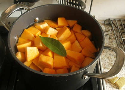 Miąższ dyni pokroić w kostkę. Zalać wywarem. Dorzucić liście laurowe, ziarenka kopru, kilka gałązek tymianku i rozmarynu. Gotować do miękkości (15–20 minut).