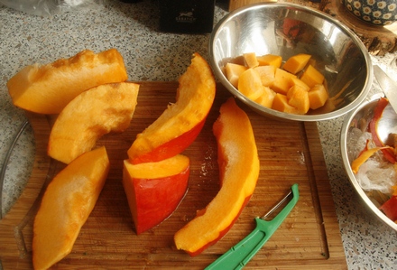 Dynię pokroić na paski, wyjąć z niej miękki środek z ziarnami, z pozostałych części usunąć skórkę. Z kostki lub dwóch sporządzić wywar warzywny.
