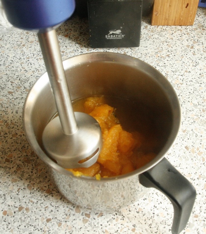 Z wywaru wyjąć kostki dyni lub odcedzić go do innego garnka. Gałązki tymianku i rozmarynu oraz listki laurowe usunąć. Kostki dyni rozetrzeć blenderem na gładką masę.