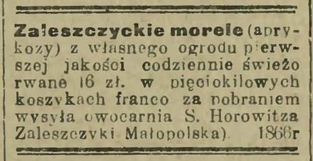 Czy zaleszczycka odmiana moreli gdzieś pozostała? Czy nadaje się do odtworzenia? Może ktoś wie? Dowodem istnienia tych wspaniałych owoców są choćby reklamy. Jak ta pochodząca z roku 1926, zamieszczona w „Kurierze Warszawskim”.