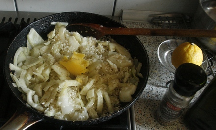 Koper przygotować jak opisano wyżej. Masło rozgrzać, zeszklić drobno pokrojone kostki cebuli, dodać ryż. Mieszając smażyć, aż wszystkie ziarenka pokryją się tłuszczem i zrobią się jakby przezroczyste. Zalać winem, a gdy zostanie przez ryż wchłonięte, dolewać bulion. Po około dwudziestu minutach, gdy ryż zacznie mięknąć, dołożyć paski włoskiego kopru, skropić sokiem z cytryny, wymieszać.