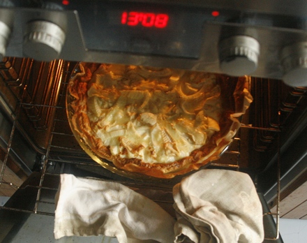 Ciasto przygotować do pieczenia zgodnie z opisem na opakowaniu, nakłuć widelcem. Piec 10–12 minut w 200 st. C. Wyjąć.