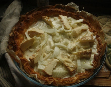 Ser mascarpone lub miękki kozi rozetrzeć z jajkami i śmietaną (dać jej tylko tyle, by masa nie była sucha), doprawić do smaku solą. Wylać na ciasto. Na płynnej, ale dość gęstej masie rozłożyć paski kopru i kawałeczki sera pleśniowego.