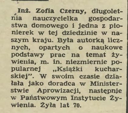 Zacznijmy od teorii. Artykulik o pomarańczach podpisała Zofia Czerny, kształcona w Paryżu inżynier (czyżby gastronom? Tu przypomina się jeden z wieczorów kabaretowych Jeremiego Przybory z zapadająca w pamięć rolą Ireny Kwiatkowskiej jako panią inżynier-gastronom Mercedes Bęc…). Zofia Czerny była bardzo na serio autorką przed wojną działąjącą w prasie, po wojnie wydającą ksiązki – nadal przez niektórych cenione! – z solidnymi przepisami, głównie z kuchni polskiej. Zmarła w roku 1964, co odnotował „Przekrój” w notce: