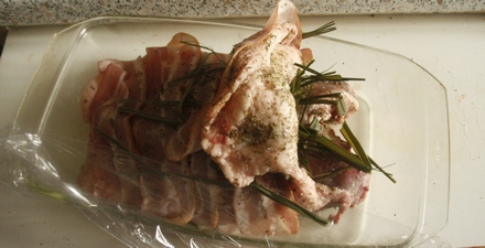 Pod skórę, w kieszenie oraz na spód gęsi nałożyć wilgotną trawkę cytrynową pozostałą po sporządzeniu z niej naparu (herbatki). Skórę nałożyć na piersi, całość pokryć plasterkami boczku, posypać pieprzem z młynka, rozłożyć jeszcze kilka źdźbeł trawki. Wstawić do lodówki.
