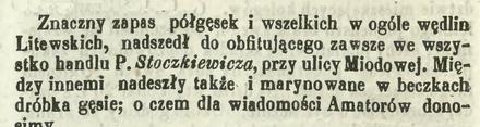 I w rzeczy samej, krom wiljowych i wielkanocnych stołów, trudno w całym roku znaleść [!] większej iedności w obiadach, iak w dniu Śgo MARCINA. Na każdym prawie stole, czy bogatym czy ubogim, gęś bywa. Po tej to biesiadzie, po oskrobaniu kości piersiowej z resztek niedogryzionego mięsa, zaczynaią wszyscy obecni wyciągać prognostyki i wróżby na nadchodzącą zimę. Jak lat poprzednich, tak i wczoraj gąska była na każdym stole w Warszawie. Skutkiem czynionych następnie obserwacji, które porównywane z sobą, okazywały się dość sprzeczne, wyprowadzamy wniosek, że następna zima nie będzie należyć do zbyt dokuczliwych, i owszem znajdzie się wciągu niej niemało dni folgi i pogody.