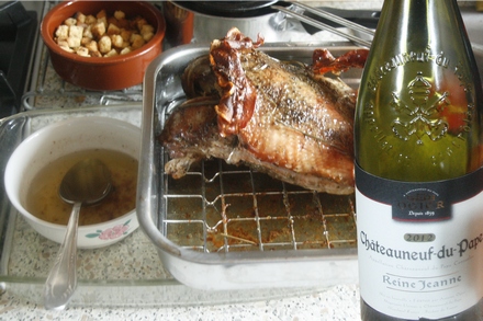 Upieczone piersi odstawia się pod przykryciem z folii na dziesięć minut, a następnie odejmuje od kości (jeżeli z nią były pieczone) i kroi w dość cienkie, ukośne plasterki. Gdy nie są zbyt spieczone, pozostają miękkie i w środku różowawe. To potrawa prawdziwie wykwintna. Poddajmy do niej najlepsze wino z naszej piwniczki (Szymku, długo czekaliśmy na otworzenie Châteauneuf-du-Pape, ale było warto; dziękujemy!).