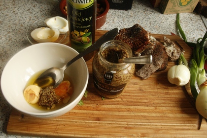 Przygotować sos: rozgnieść żółtko, dodać łyżeczkę musztardy, wymieszać, dodawać po trochu olej. Ma być go tyle, aby sos nie był zbyt rzadki. Doprawić do smaku pieprzem i cukrem oraz, jeżeli potrzeba, solą. Na końcu wlać pół łyżki octu lub więcej oraz posiekaną dymkę.